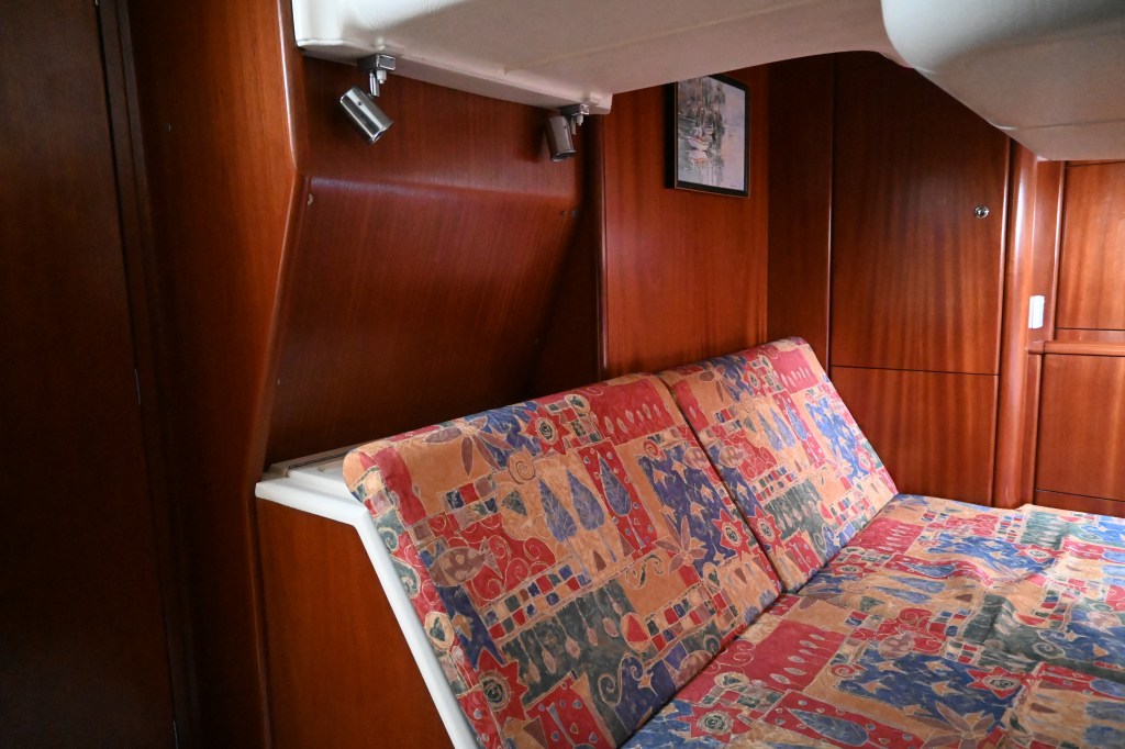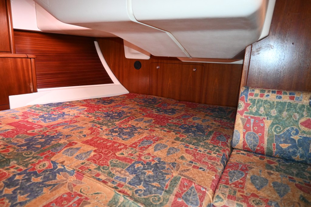 - Very large fore and aft double bed in cabin that extends the full width of boat, Air flow topper, large under bunk storage bins and access to fuel tank, access to engine and engine seacock, aft access to steering gear and battery charger