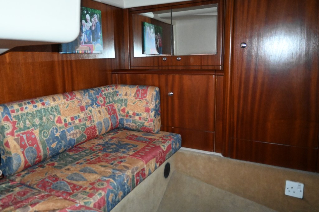 - 2 hanging lockers to port and starboard, vanity unit to port, similar unit on starboard side for storage, seat with stowage under