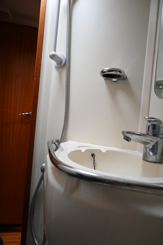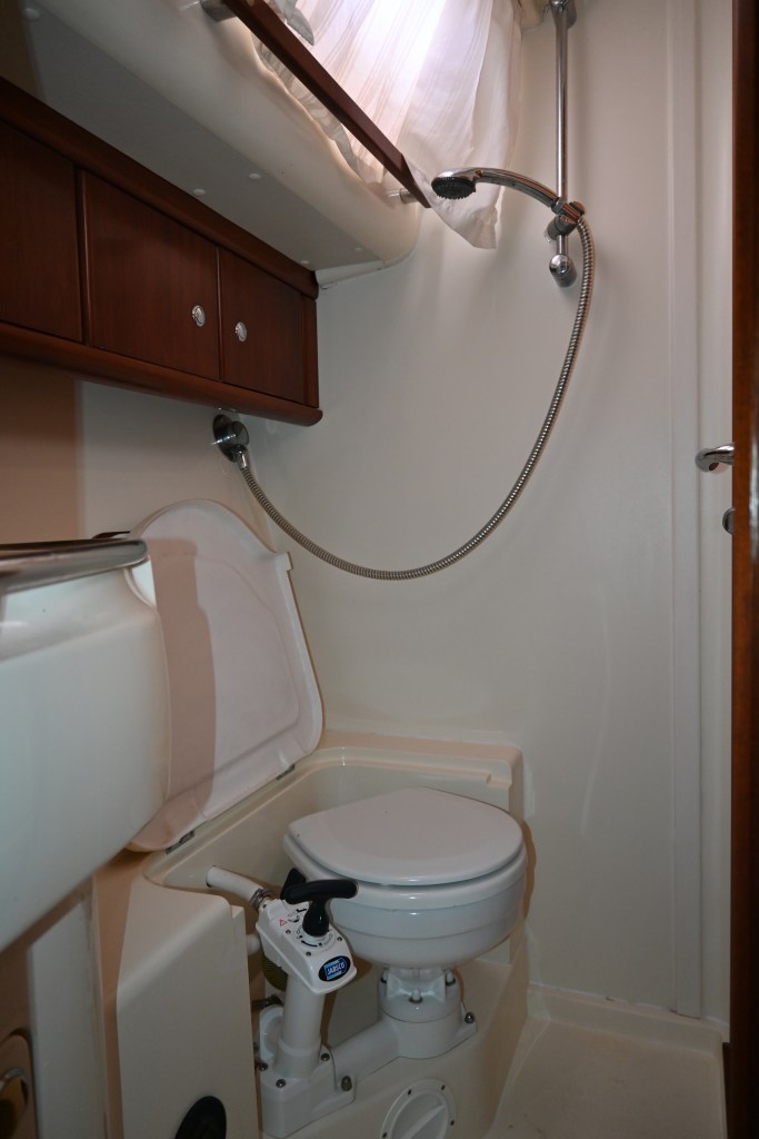 - Wash basin and shower with hot / cold pressurised water, electric operated marine toilet with sanitiser unit and outlet via diverter valve to sea or holding tank