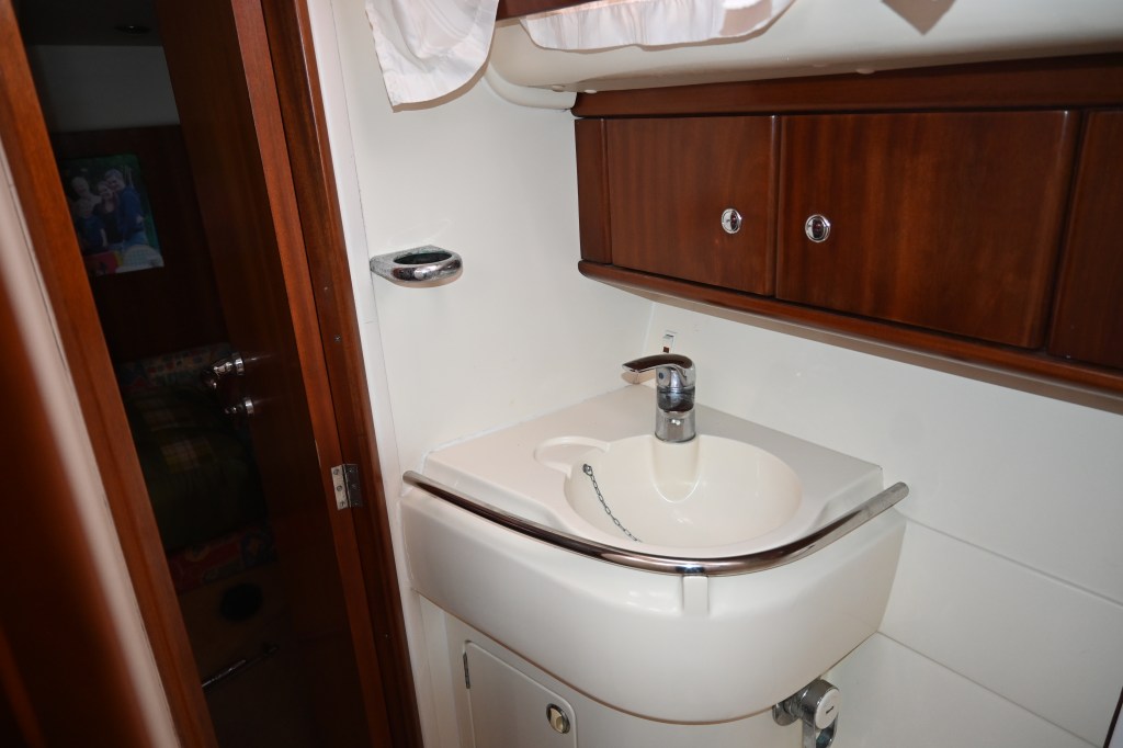 - 3 eye level lockers, storage locker under wash basin giving access to pumps and hull outlet valve, mirror