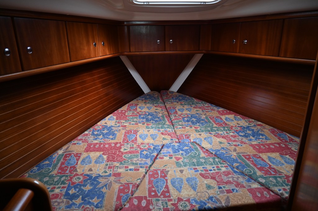 - 2 single V berths with fill in piece to convert to double, V shaped memory foam topper, large moulded storage bins under berths