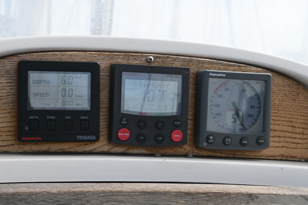 Instrumentation panel above hatch – Instruments: Raytheon tridata ST50 (log, speed and echo sounder), Autohelm ST 6000 control driving Autohelm 6000 linear drive via the upgraded S3 course computer, Raytheon wind speed and direction.