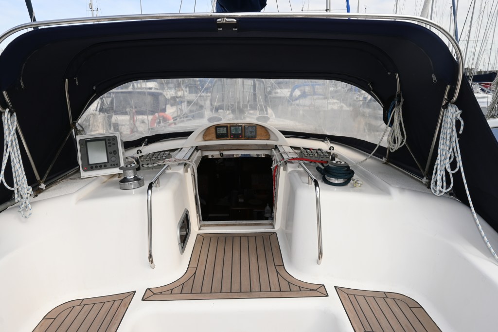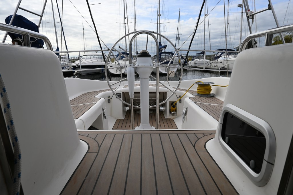 Huge port side cockpit locker housing Eberspacher heating system (last serviced Dec 2024), Zodiac 2.6m (6man) inflatable dinghy, engine blower, teak cockpit table, Cruising Chute on Harken furler in bag and Whale manual bilge pump. Enough space for all fenders.