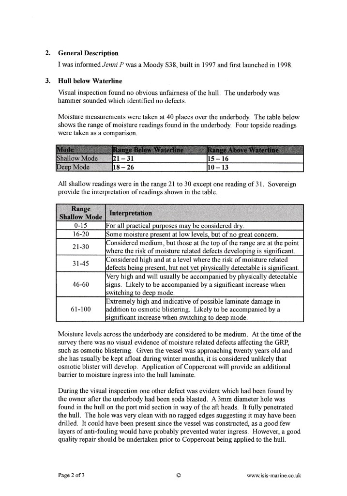 Note re the above: The hole in the aft heads area referred to in the report was repaired as suggested by K. Horn (fibreglass contractor). This hole had not been present from new as suggested but was accidentally drilled by myself re-tapping a screw hole in the inner heads framework 2 days before the survey.